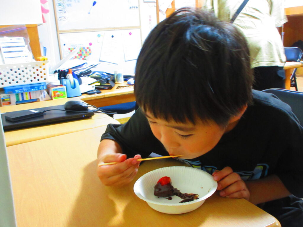 9月のクッキングレクは「チョコフォンデュ」でした。バナナ、いちご、パン、マシュマロ等子どもたちがリクエストした材料にチョコソースをつけ「美味しい」と喜んで食べていました。
