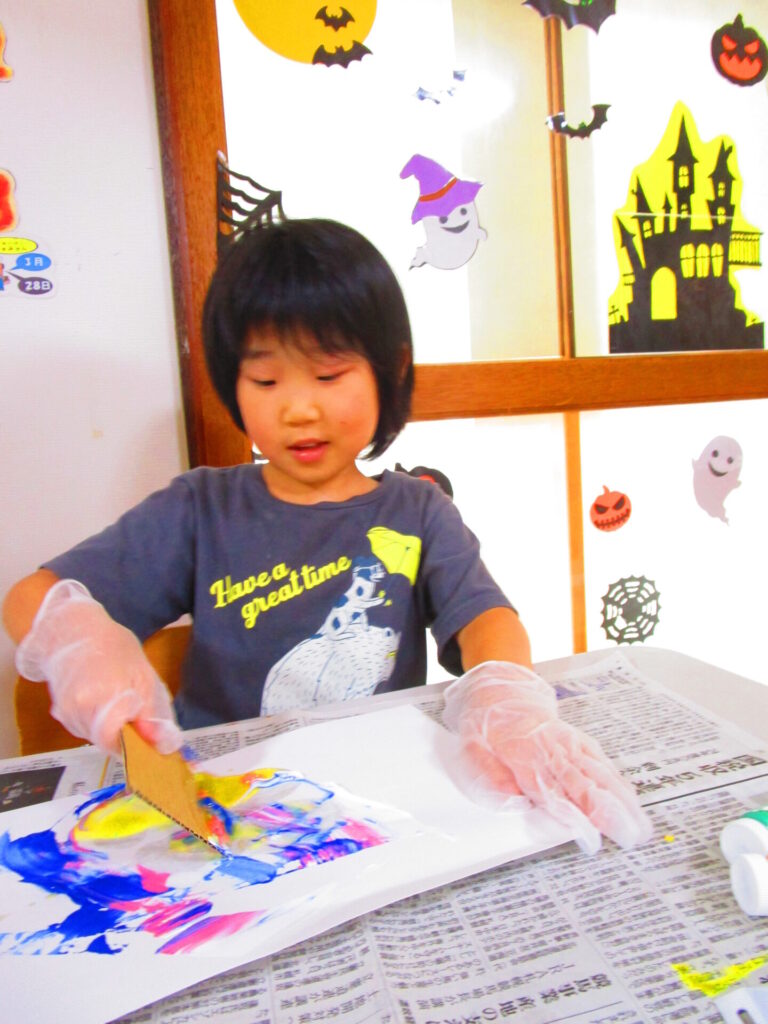 10月の制作活動「スワイプアート」に取り組みました。いろとりどりの絵の具を塗り伸ばして、型に合わせて切り抜き、目を付けたらカラフルおばけが出来ました。