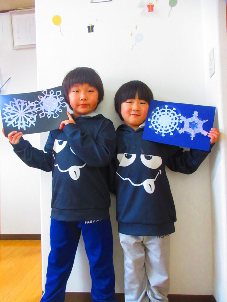 12月の制作活動「折って切る雪の結晶づくり」を行いました。切ってみたらとても綺麗な結晶の形ができ、冬を感じられるとてもいい作品になりました。