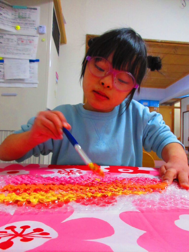 2月の制作は『プチプチ梱包材で転写アート』でした。プチプチに好きな絵具を塗り広げ画用紙に転写して出来る模様を楽しみました。