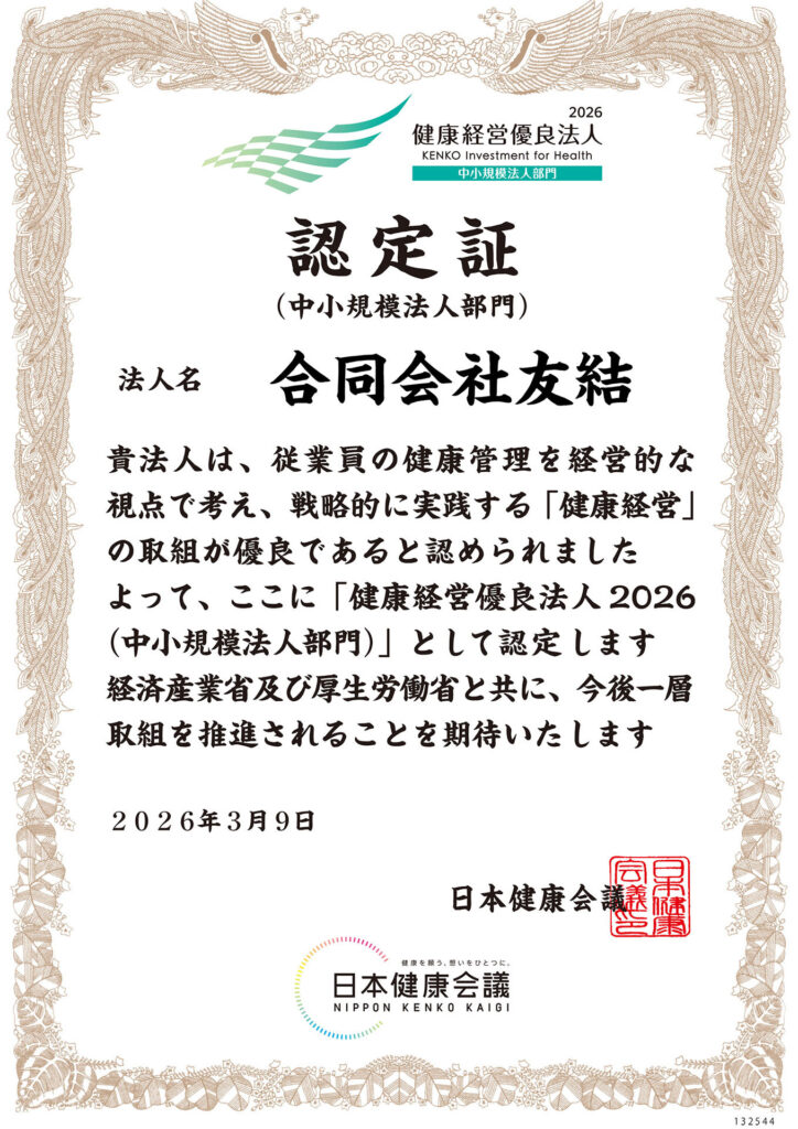 この度、合同会社 友結は「健康経営優良法人2026(中小規模法人部門)」に認定されました。